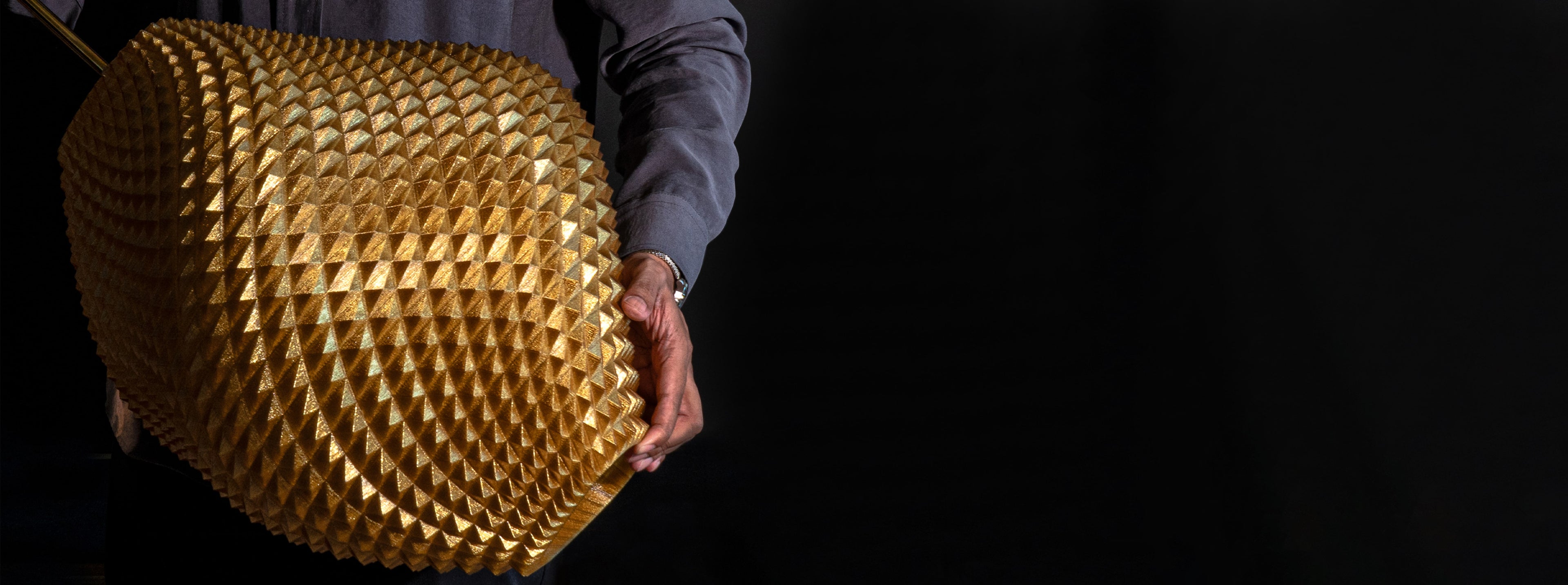 Finished in a radiant sunset gold, the fixture glows with a warm, shimmering brilliance reminiscent of molten gold, elevating its sculptural form with a luxurious, jewel-toned richness. The reflective surface enhances ambient light while accentuating the precise geometry of the design, making it a captivating focal point in both intimate and expansive spaces.