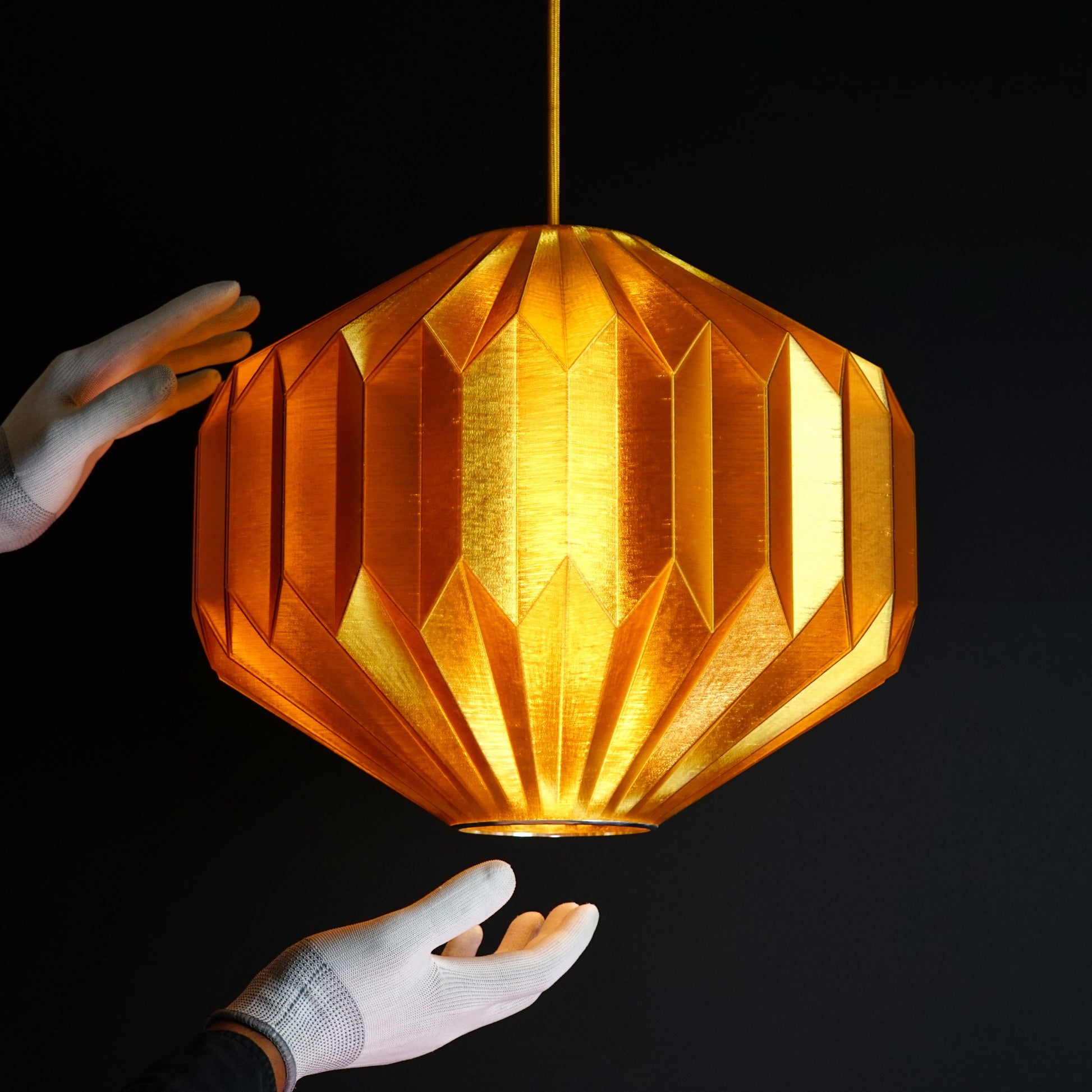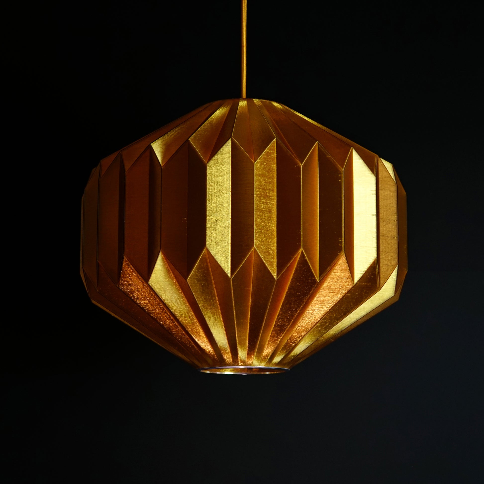 The Jewel Sun Gold Origami Pendant Light is a sculptural masterpiece that brings together geometry, color, and craftsmanship. Its surface is defined by a faceted origami pattern, where crisp folds and angular planes create a play of light and shadow that changes with every angle. The dome-like structure enhances its architectural presence, making it as much an art piece as it is a lighting fixture.